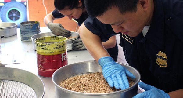USCBP 农业专家 David Ng 和 Amanda Furrow 在巴尔的摩港口检查旅客携带的种子;Credit:NPR