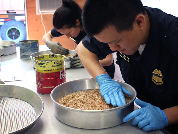 USCBP 农业专家 David Ng 和 Amanda Furrow 在巴尔的摩港口检查旅客携带的种子;Credit:NPR